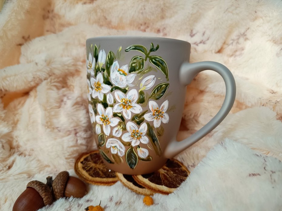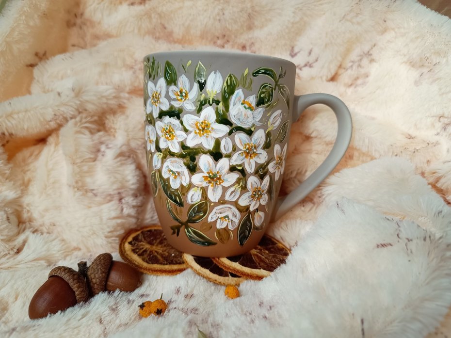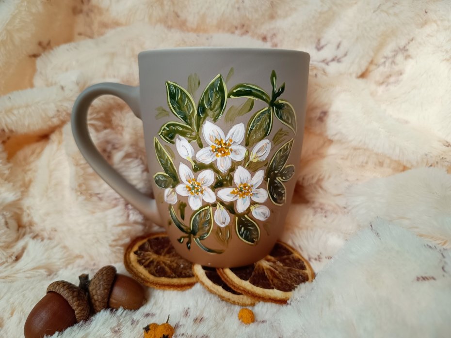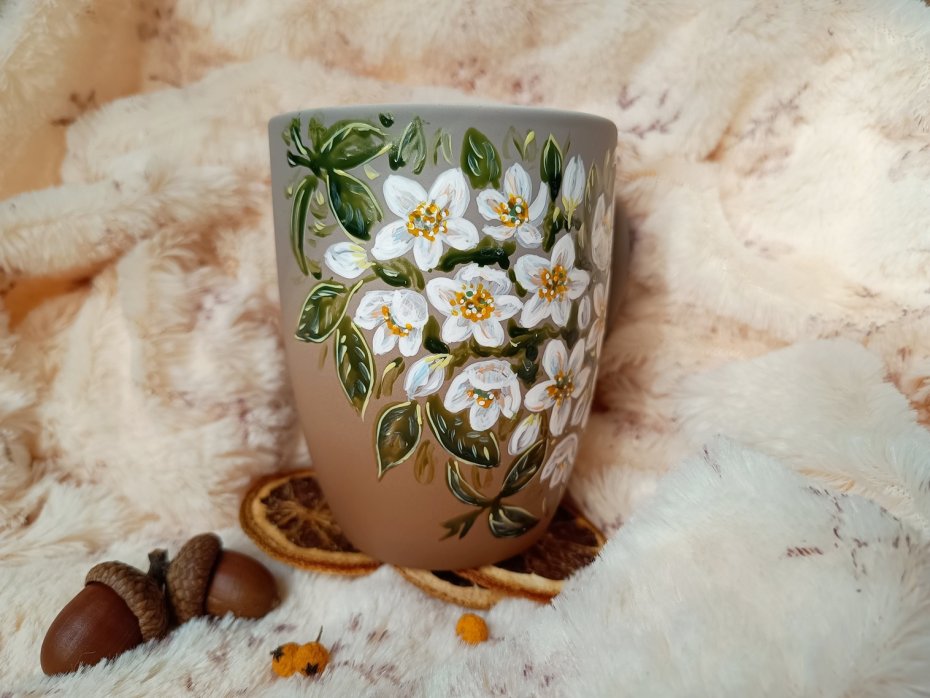 Ręcznie malowany kubek z kwitnącym jaśminem.
