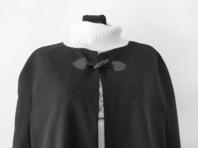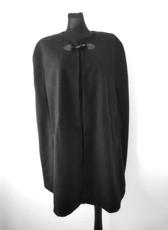 Zgrabna peleryna z poliestrowej tkaniny z wełna w czarnym kolorze. Zapinana u góry na plastikowy kołek z ozdobnym sznurem. Z otworami na ręce , z dwiema wpuszczanymi kieszeniami. całość na podszewce.