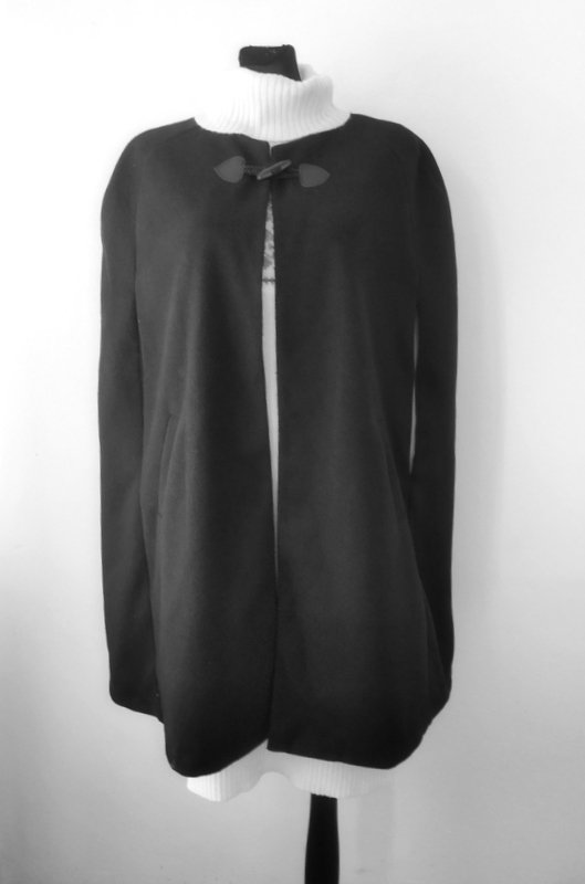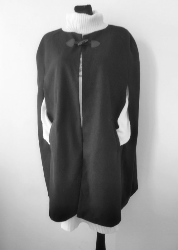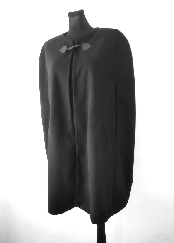 Zgrabna peleryna z poliestrowej tkaniny z wełna w czarnym kolorze. Zapinana u góry na plastikowy kołek z ozdobnym sznurem. Z otworami na ręce , z dwiema wpuszczanymi kieszeniami. całość na podszewce.
