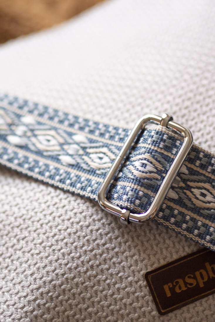 Torebka posiada regulowany, kolorowy pasek w kwiaty i srebrne okucia.