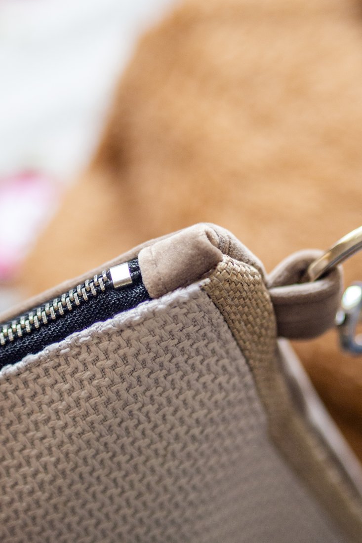 Prosta torebka, kopertówka w średnim rozmiarze wykonana z jasnobrązowego weluru. Przód z plecionki ecru. Zapinana na suwak.