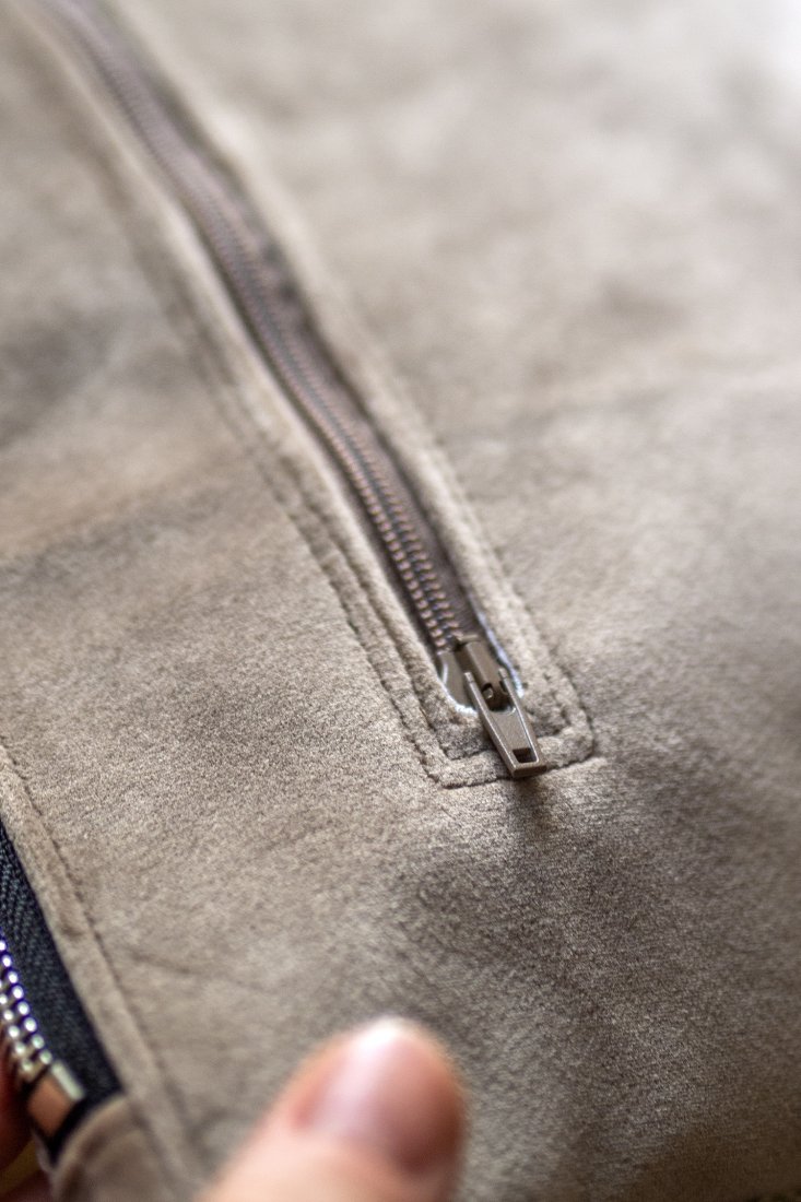 Małe zaszewki na dnie. Z tyłu oraz w środku torebki kieszonki zapinane na suwak. Środek wykończony białą bawełnianą podszewką.