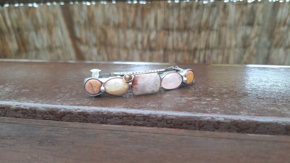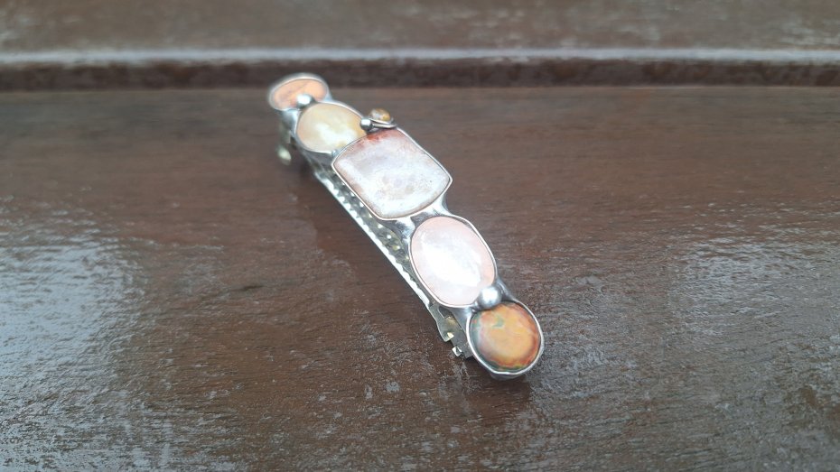 Klamra do włosów, wykonana z miedzi, cyny, koralowca, jaspisu, turmalinu, kwarcu i agatu. Wymiary ok. 8 na 1.5 cm. Zapięcie 6 cm, metalowe.