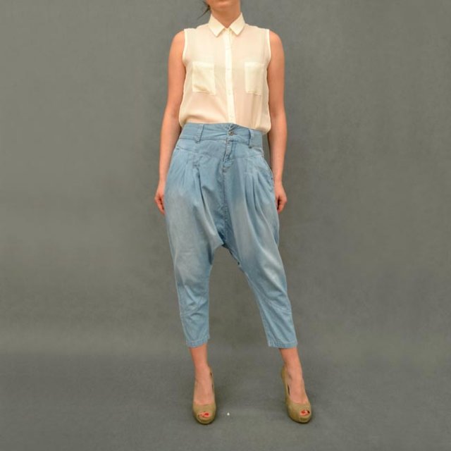 Świetne letnie pumpy z miękkiego i cienkiego dżinsu. Marka ONLY, model HAREM FIT. Jasne, na dole zakończone zameczkami, krok obniżony ;) Polecam.