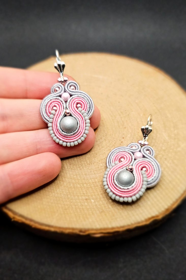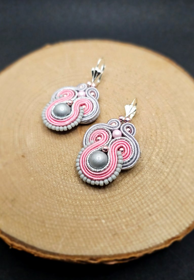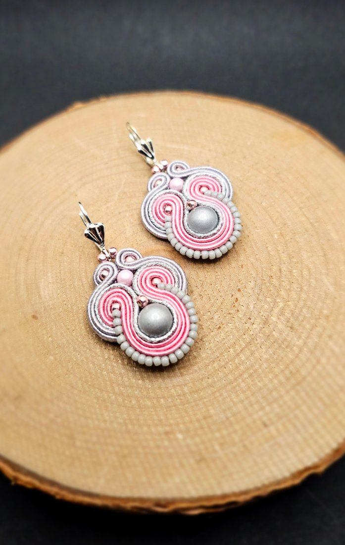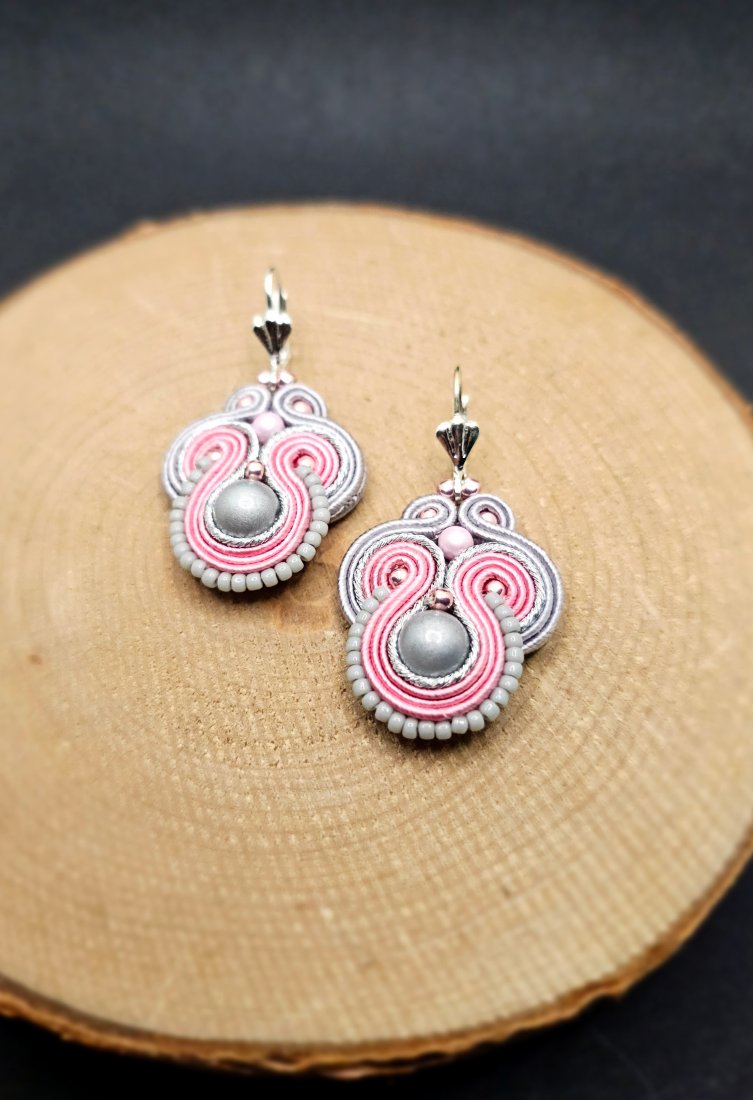 Kolczyki w kolorze różowo-szarym z szklanymi kulkami. Srebrne kulki otoczone sznurkami sutasz oraz szklanymi koralikami w kolorze szarym i różowym o różnych wielkościach. Srebrny metalizowany sznurek dodaje kolczykom elegancji i wyrazistości. Kolczyki zawieszone na ozdobnych biglach angielskich w kolorze srebrnym.