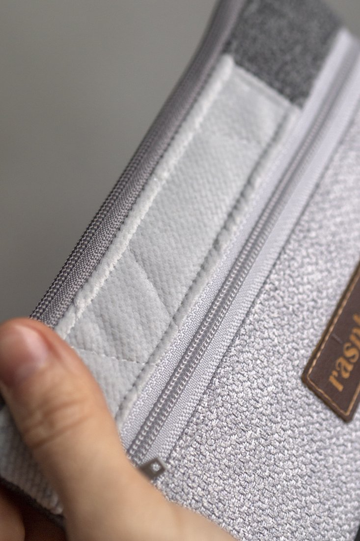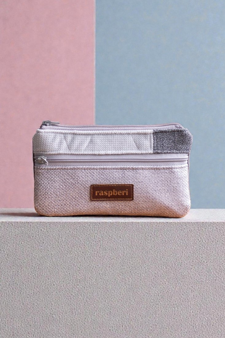 Prosty wodoodporny portfel wykonany z kilku rodzajów tkanin w odcieniach szarości.