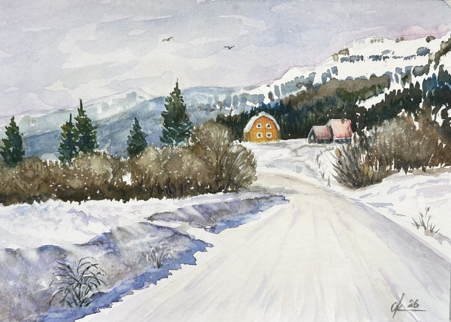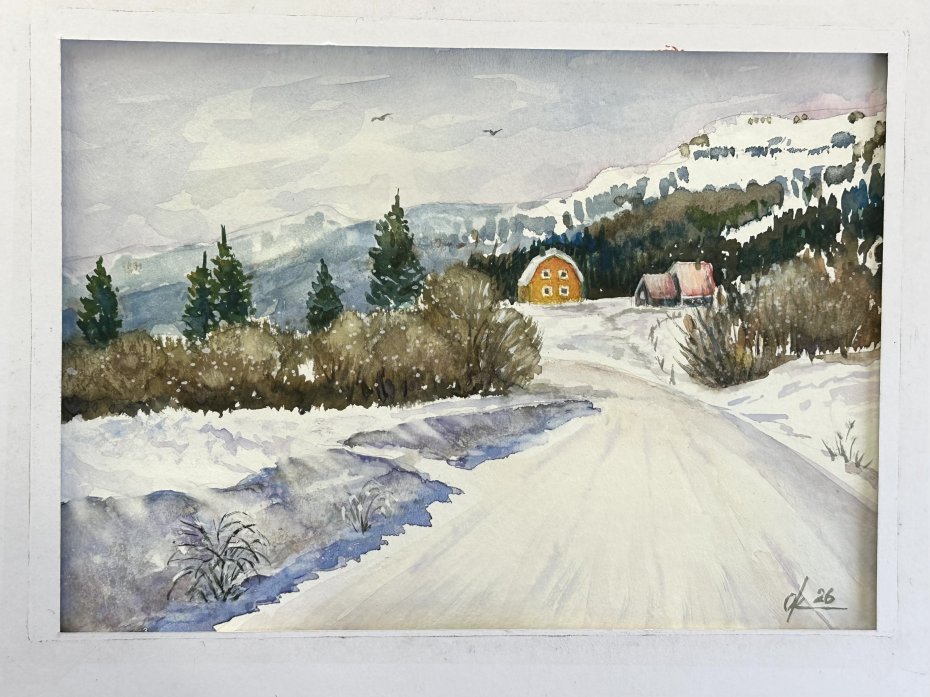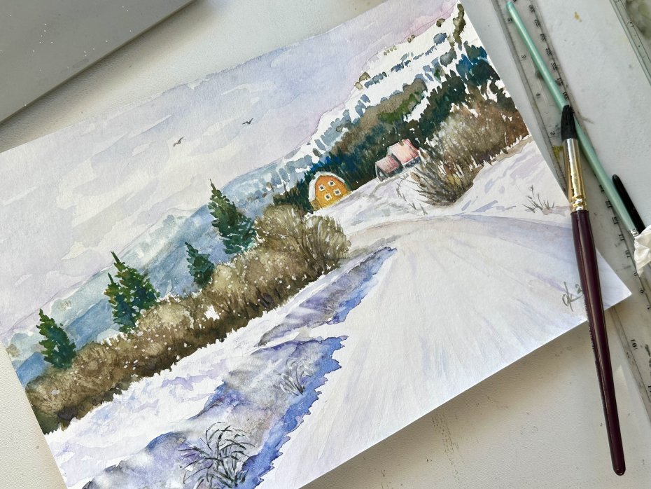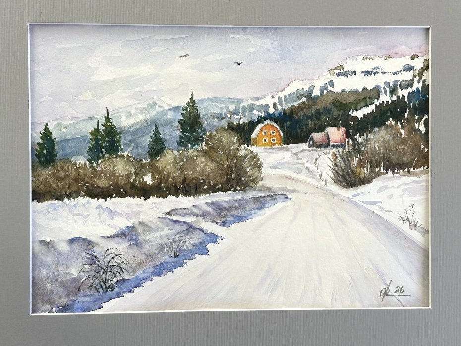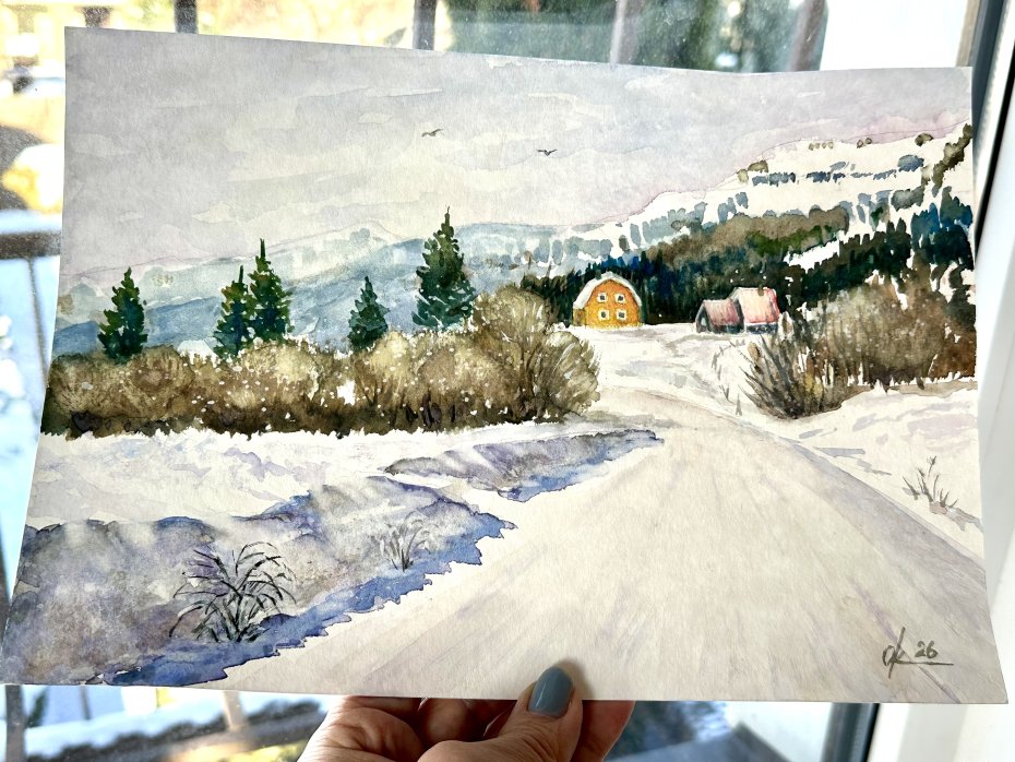 Tagi: #akwarelowy krajobraz, #jasny dzień śnieg i góry, #original akwarela, #zimowy krajobraz