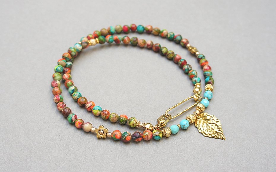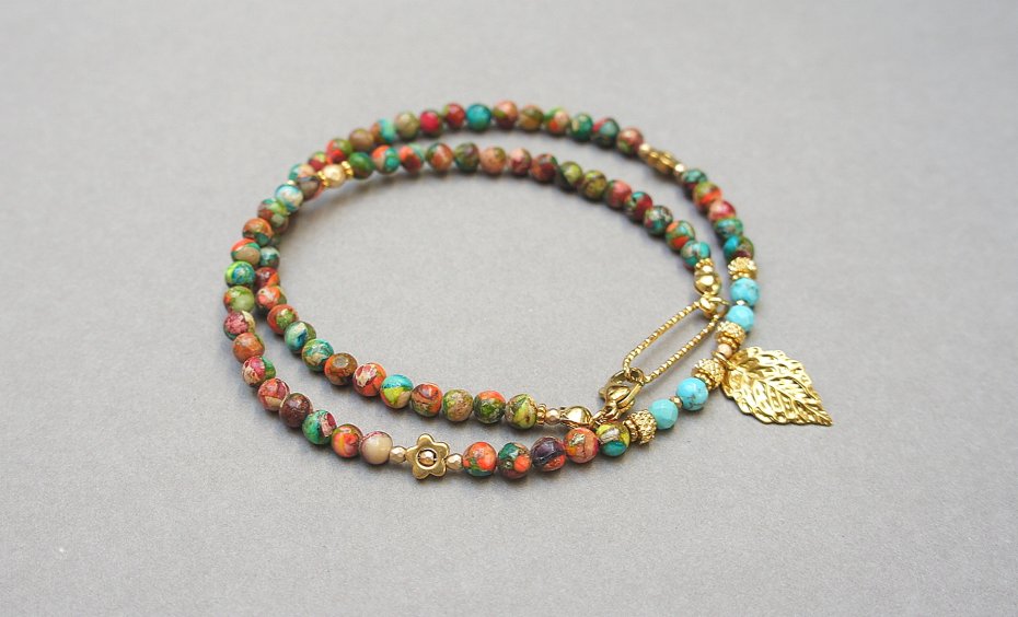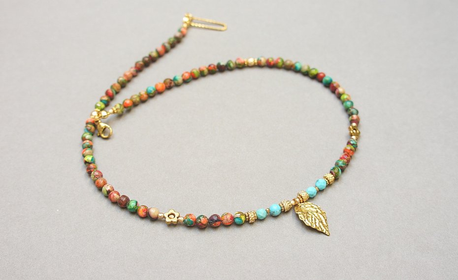 Krótki, delikatny naszyjnik wykonany w całości z pozłacanej stali szlachetnej oraz naturalnych kamieni - jaspis cesarski [4mm], turkus fasetowany [3mm], hematyt fasetowany, platerowany [3mm i 2mm], przekładek z hematytu [1mm oraz 6mm - kwiatki]. Naszyjnik o długości ok. 42cm.