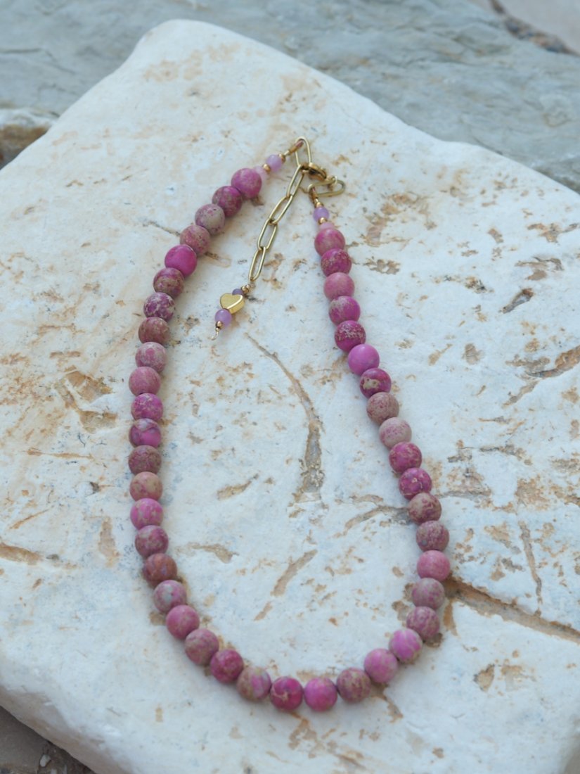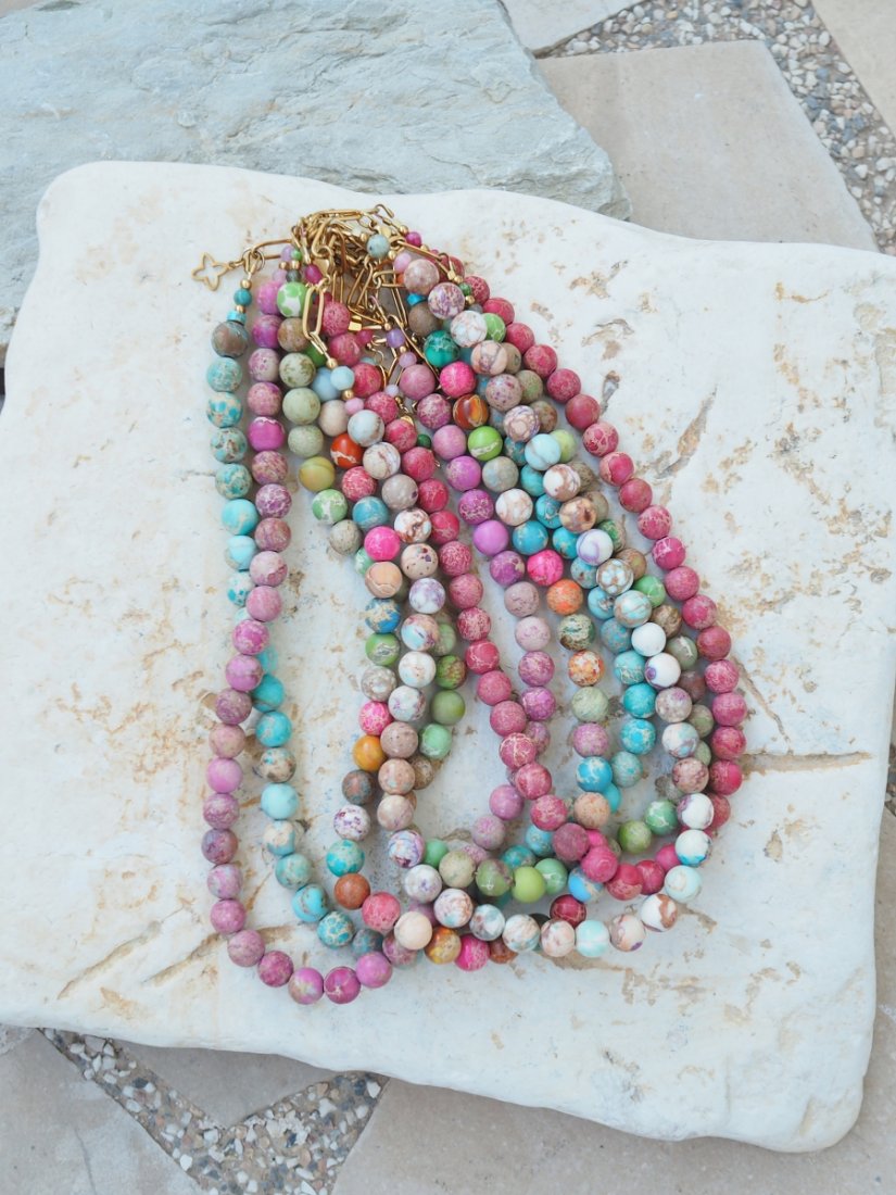 Naszyjnik z kamienia Jaspis Cesarski to podróż przez kolory natury – od mięty i turkusu, po odcienie różu, piasku i brązu. Każdy koralik ma swój własny rysunek, jakby zamknięto w nim fragment pejzażu – dlatego każdy naszyjnik jest absolutnie niepowtarzalny.