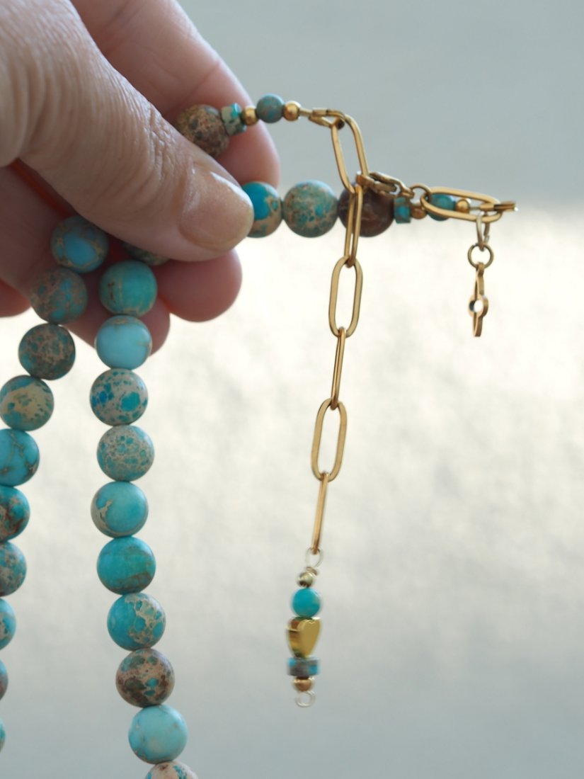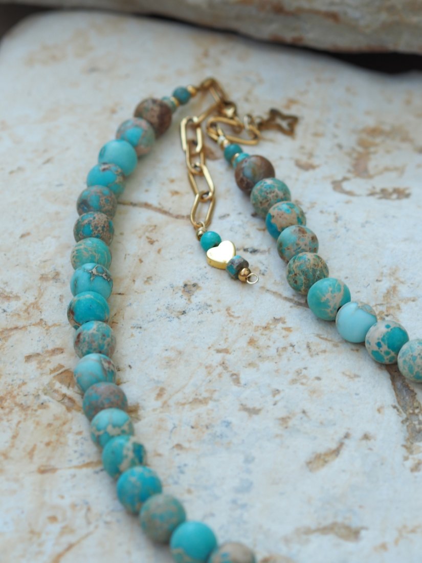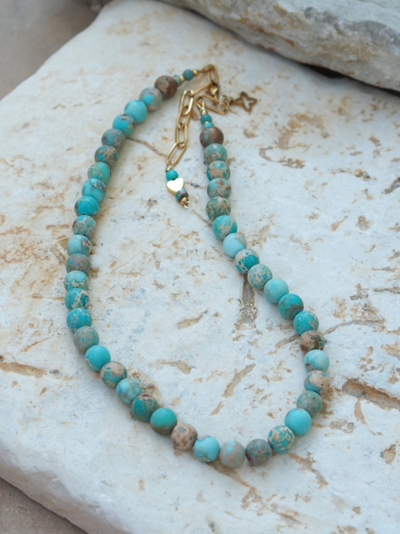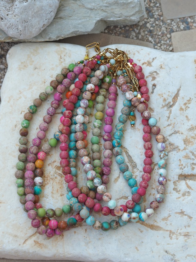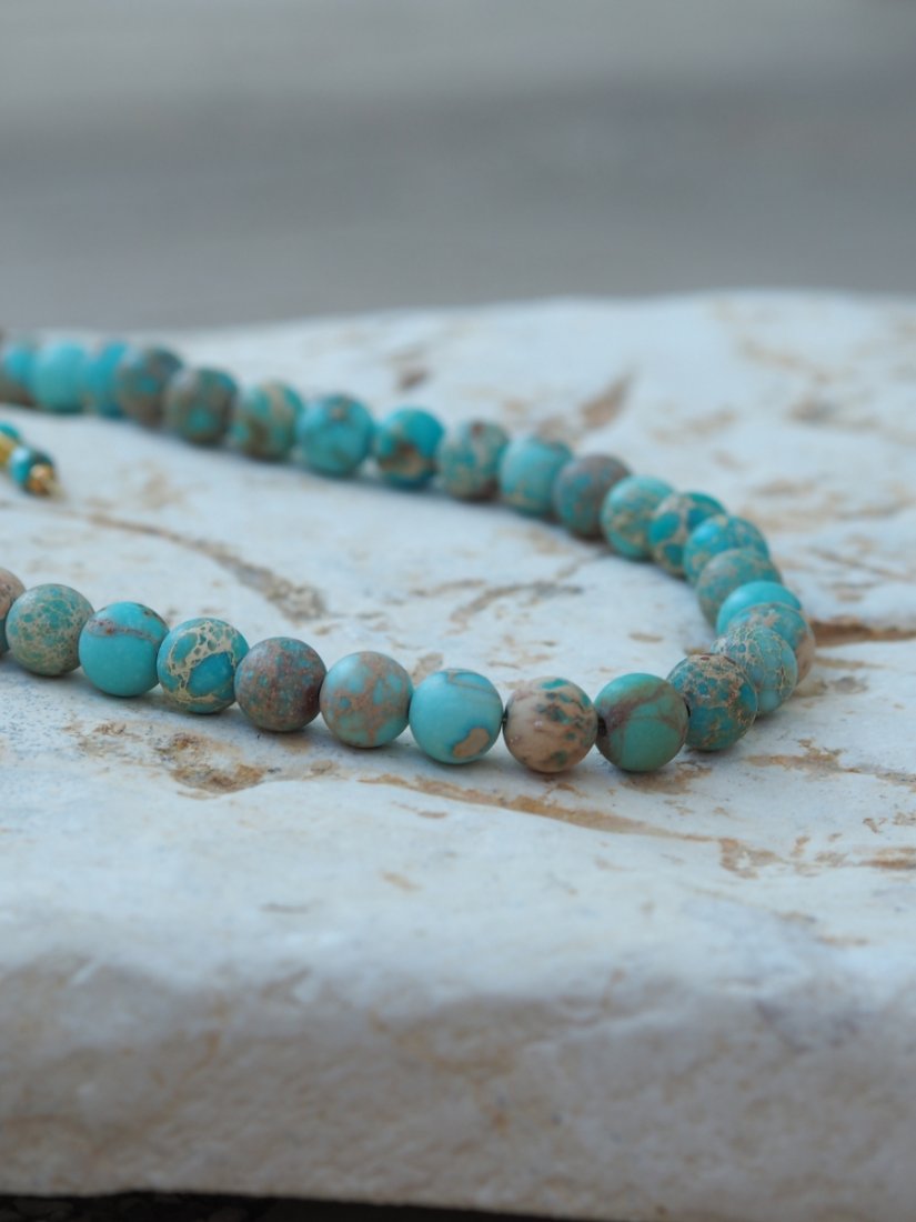 Naszyjnik z kamienia Jaspis Cesarski to podróż przez kolory natury – od mięty i turkusu, po odcienie różu, piasku i brązu. Każdy koralik ma swój własny rysunek, jakby zamknięto w nim fragment pejzażu – dlatego każdy naszyjnik jest absolutnie niepowtarzalny.