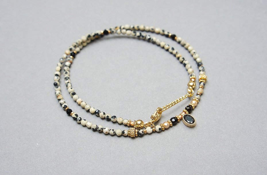 Krótki, delikatny naszyjnik wykonany w całości z pozłacanej stali szlachetnej oraz naturalnych kamieni - jaspis fasetowany [3mm],spinel fasetowany [3mm], hematyt fasetowany, platerowany [3mm i 2mm], przekładek z hematytu [1mm] oraz zawieszki z cyrkonią w okuciu. Naszyjnik o długości ok. 43cm.