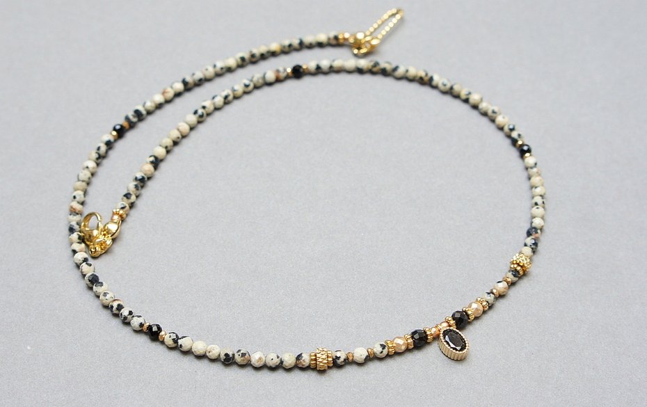 Krótki, delikatny naszyjnik wykonany w całości z pozłacanej stali szlachetnej oraz naturalnych kamieni - jaspis fasetowany [3mm],spinel fasetowany [3mm], hematyt fasetowany, platerowany [3mm i 2mm], przekładek z hematytu [1mm] oraz zawieszki z cyrkonią w okuciu. Naszyjnik o długości ok. 43cm.