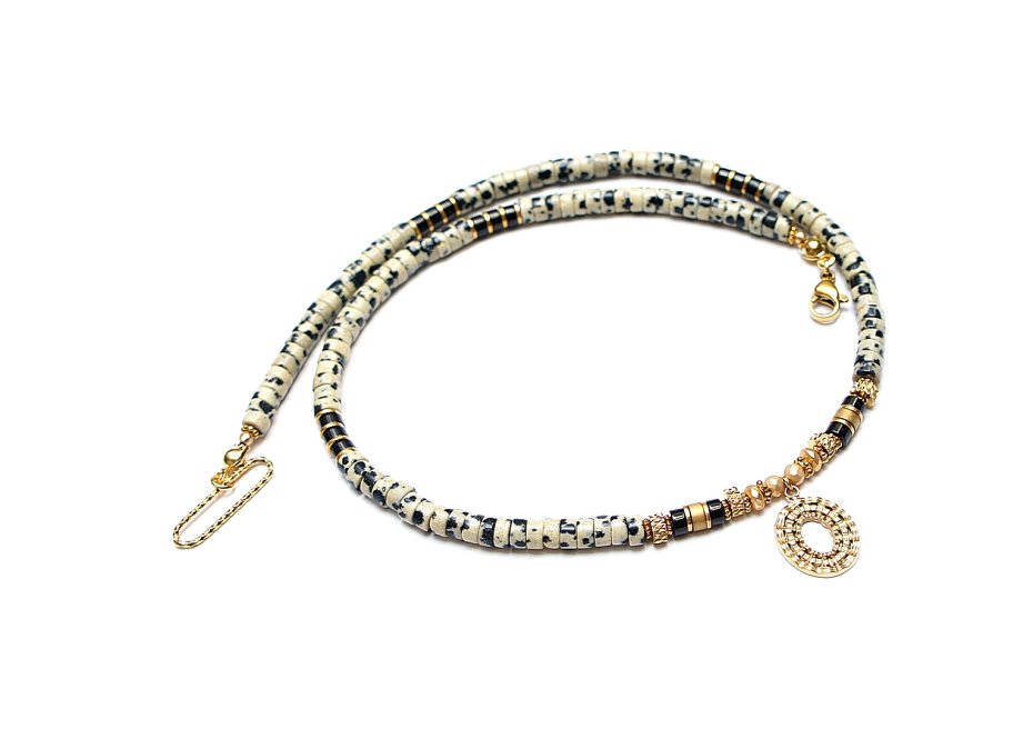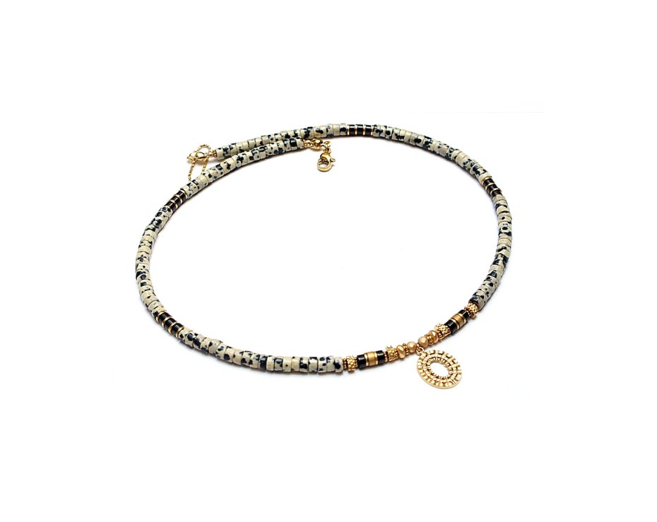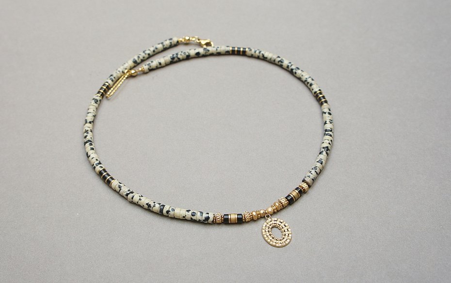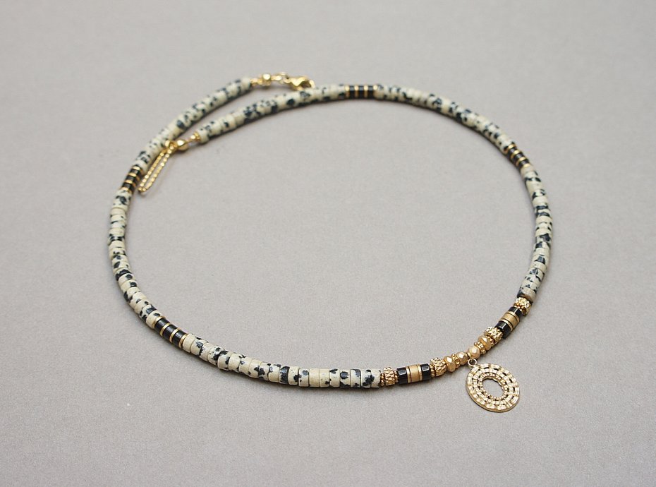 Krótki, delikatny naszyjnik wykonany w całości z pozłacanej stali szlachetnej oraz naturalnych kamieni - talarki jaspisu [4 x 2mm],talarki hematytu matowego [4 x 2mm], talarki hematytu czarnego [4 x 2mm], hematyt fasetowany, platerowany [3mm i 4 x 2mm]. Naszyjnik o długości ok. 42,5cm.