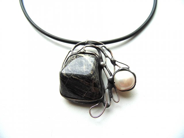 Wisiorek wykonany techniką witrażową z minerału jaspisu i perły. Wymiary ok. 5 na 4,5 cm. Zawieszony na czarnej lince kauczukowej o długości ok. 45 cm.