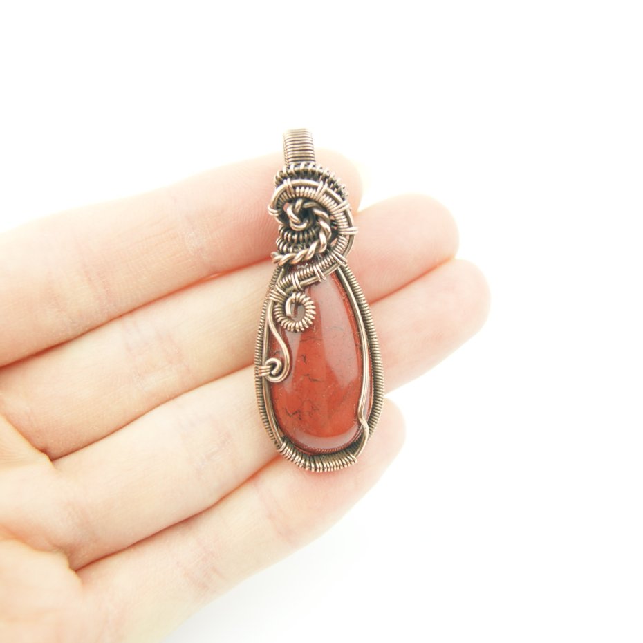 Wisiorek powstał z jaspisu mokaitu w kształcie łezki. Kamień otrzymał misternie plecioną, miedzianą oprawę. Biżuteria wykonana techniką wire wrapping, oksydowana.