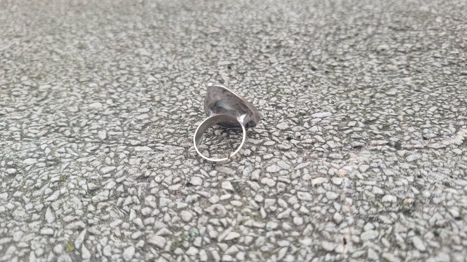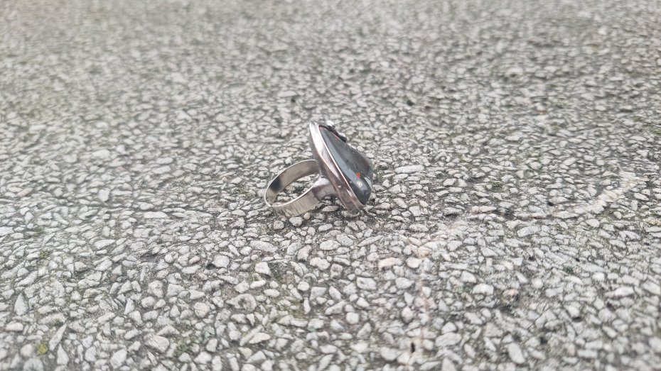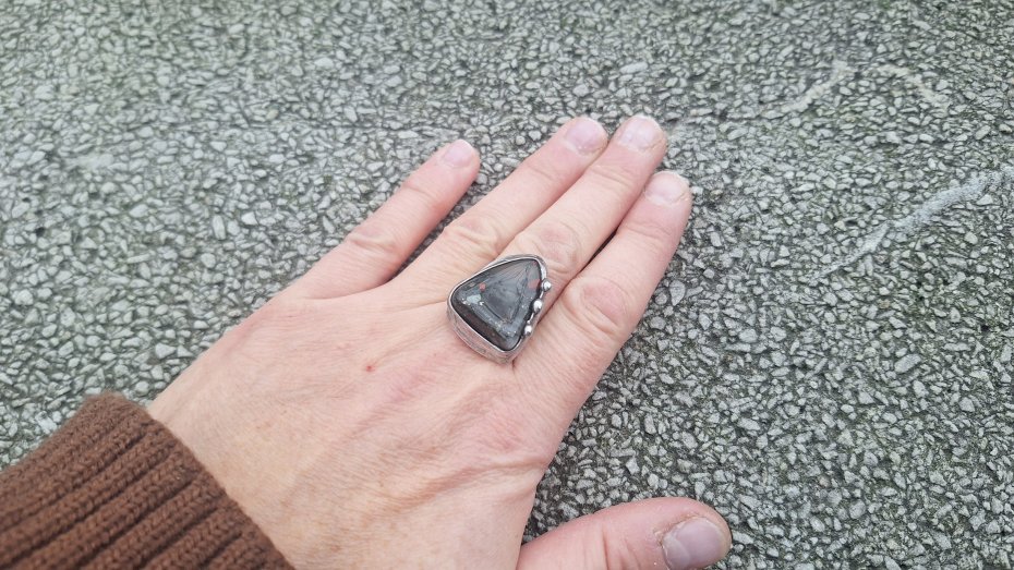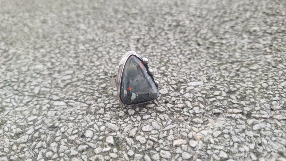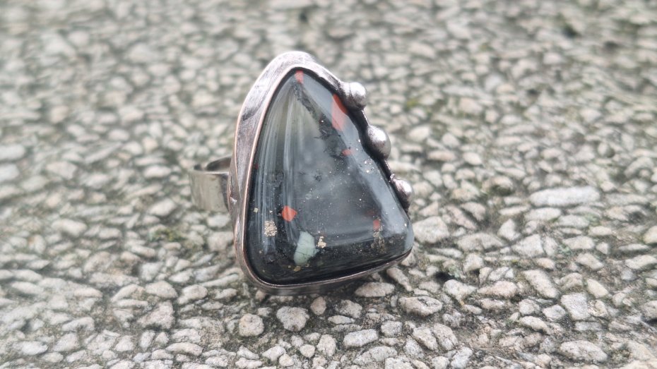 Pierścionek wykonany z miedzi, cyny i jaspisu. Wymiary ok. 2.5 na 1.8 cm. Regulowany. Nie jest ciężki.