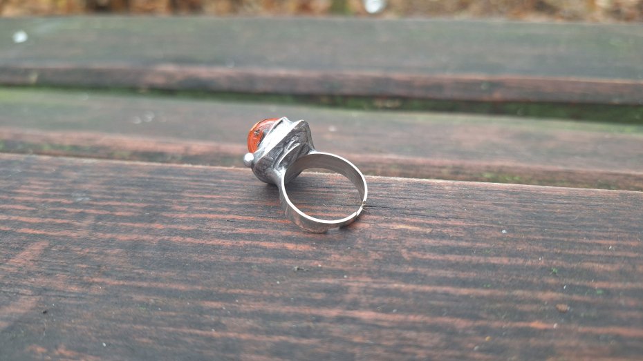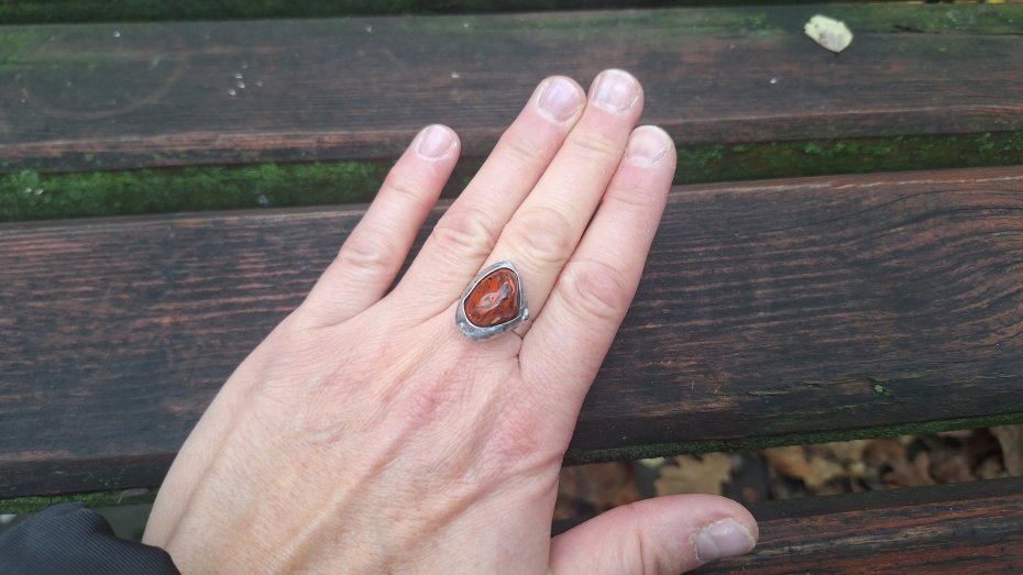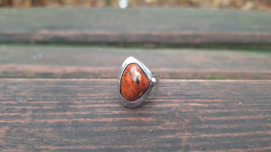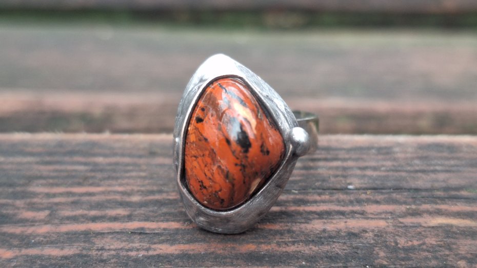 Pierścionek wykonany z miedzi, cyny i jaspisu. Wymiary ok. 2 na 1.4 cm. Regulowany. Nie jest ciężki.