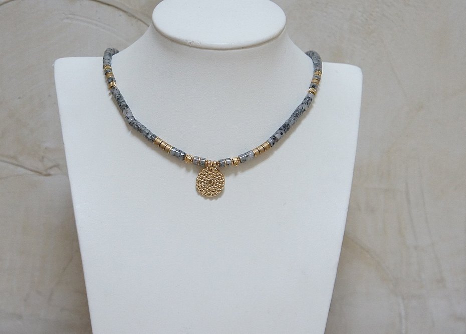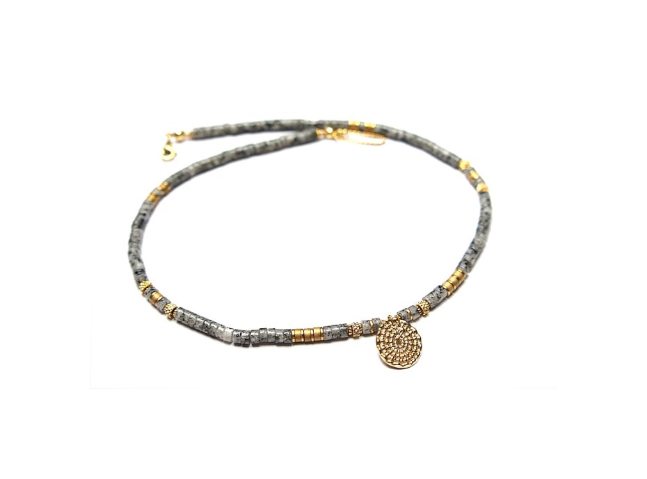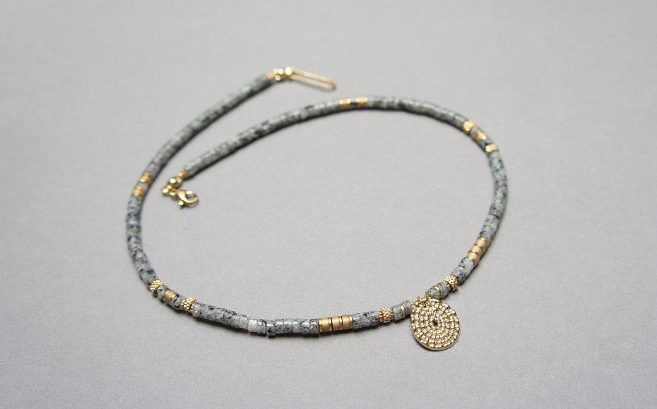 Krótki naszyjnik wykonany w całości z pozłacanej stali szlachetnej oraz naturalnych kamieni - talarki jaspisu plamistego [4 x 2mm], talarki matowego hematytu [3 x 2mm]. Naszyjnik o długości ok. 43,5cm.
