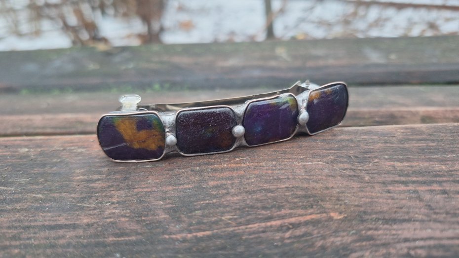 Klamra do włosów, wykonana z miedzi, cyny i jaspisów. Wymiary ok. 8 na 1.5 cm. Zapięcie 6 cm, metalowe.