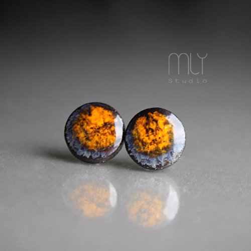 Ceramiczne kolczyki w formie sztyftów, ręcznie wykonane z delikatnej gliny kamionkowej, jednostronnie szkliwione mieszanką szaro pomarańczowych szkliw z efektem plamek, na antyalergicznych sztyftach w kolorze srebrnym.Średnica ok. 11mm.Polecam