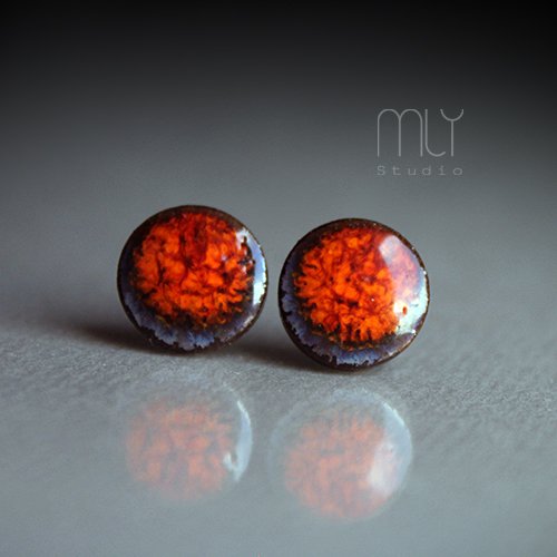 Ceramiczne kolczyki w formie sztyftów, ręcznie wykonane z delikatnej gliny kamionkowej, jednostronnie szkliwione mieszanką szaro pomarańczowych szkliw z efektem plamek, na antyalergicznych sztyftach w kolorze srebrnym.Średnica ok. 11mm.Polecam