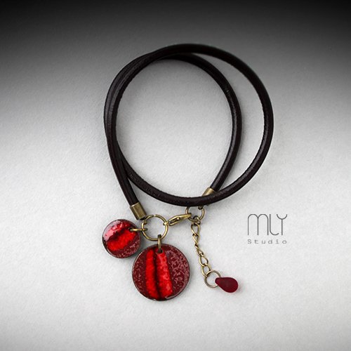 Efektowna bransoletka wykonana z rzemienia jubilerskiego, elementów w kolorze miedzi i ręcznie wykonanych ceramicznych zawieszek, szkliwionej mieszanką czerwonych szkliw z efektem plamek, Obwód regulowany, długość elementu ceramicznego ok 1,8cm i 1,2. Polecam . Termin realizacji zamówienia to 1-2 dni.