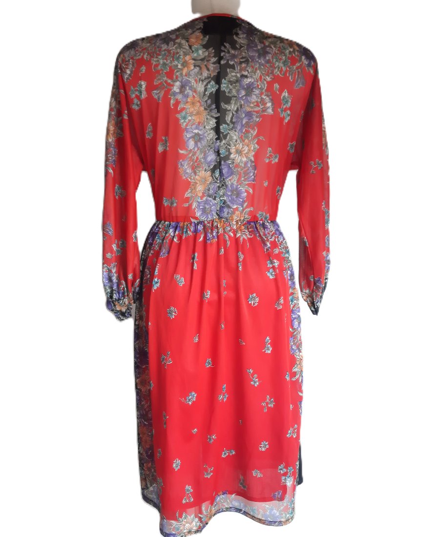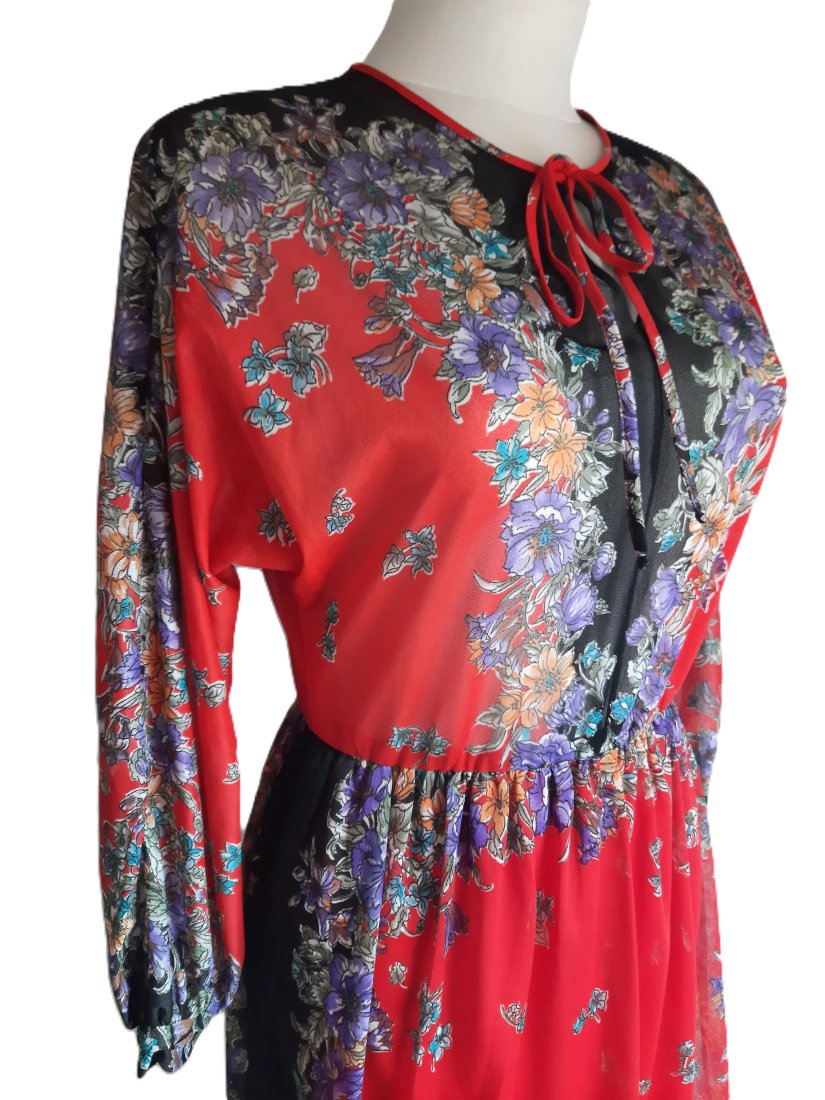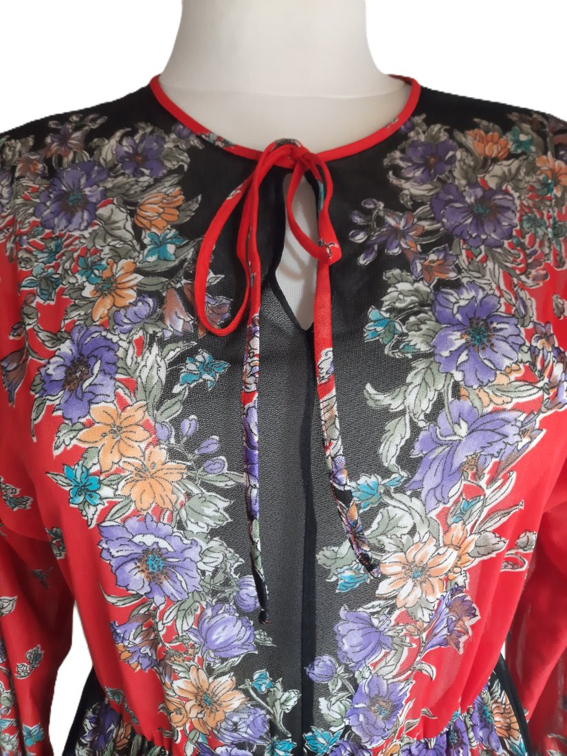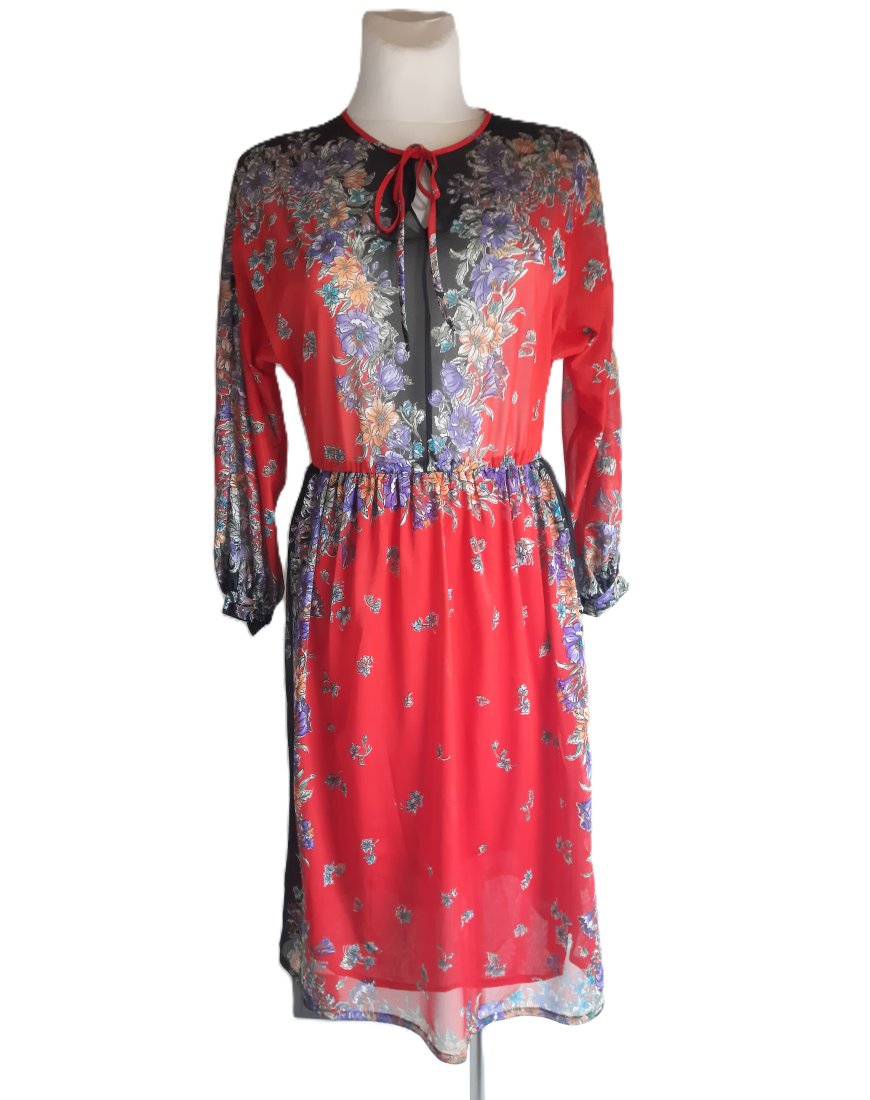 piękna czerwona sukienka vintage z lat 70/80-tych z kolorowym motywem kwiatowym, pod szyją wiązana, dekolt z rozcięciem. długi lekko "nietoperzowy" rękaw z mankietem zapinanym na zatrzask, w pasie wszyta gumka, długość midi, dół na podszewce, góra i rękawy lekko prześwitujące, w pasie szlufki (paska brak), cienki, delikatny materiał
