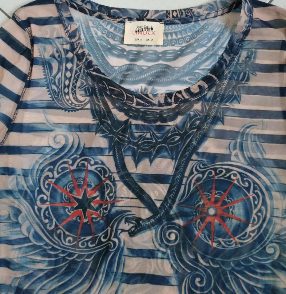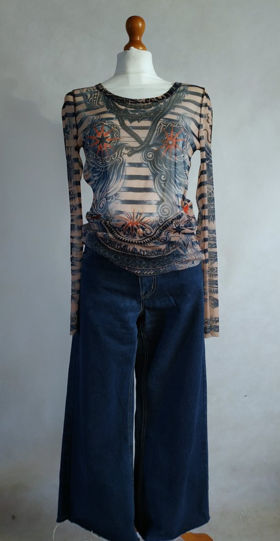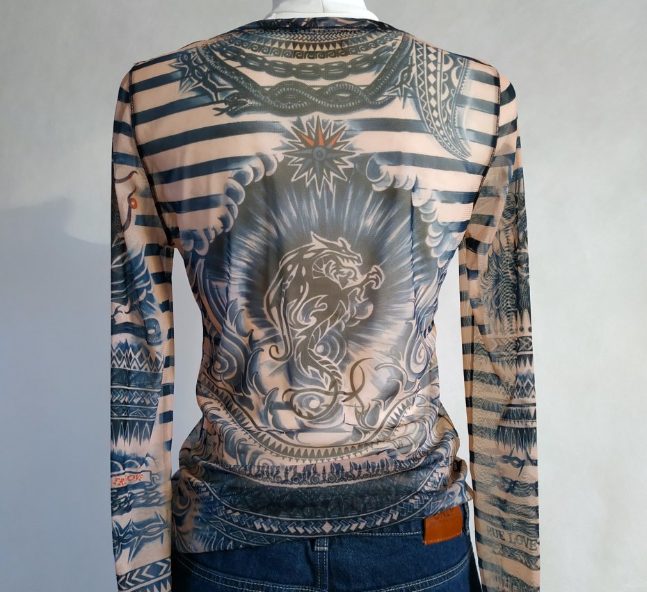 tiulowa siateczka z wzorem tatuaży, kolor cielisty, cieniowany granatowy/jeansowy oraz czerwone akcenty.Stan idealny.