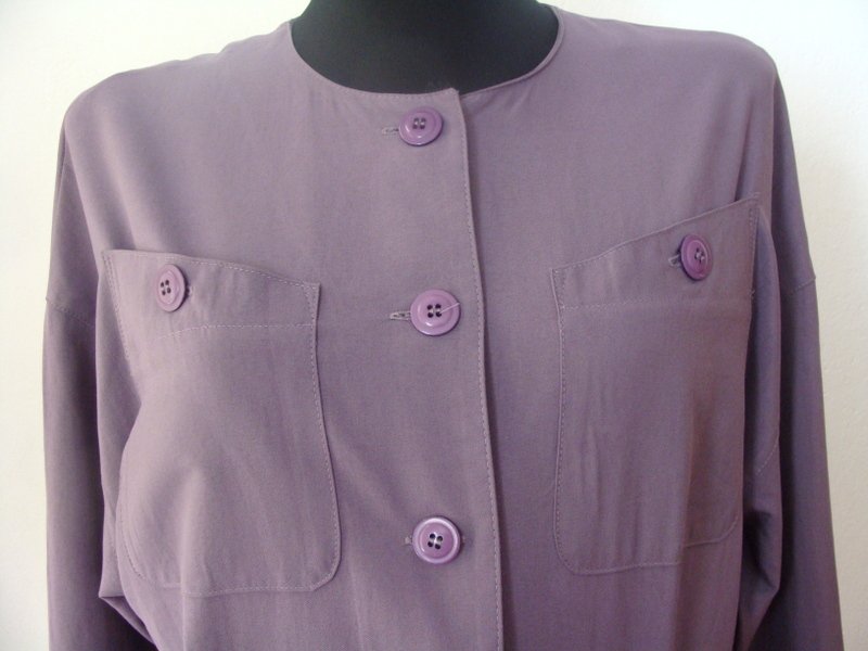 Zgrabna sukienka vintage z wiskozowej tkaniny z poliestrem w kolorze zgaszonego fioletu o wrzosowym odcieniu. Odcinana w pasie od pasa w górę z przodu po jednej zakładce z tyłu po dwie zakładki , dół ołówkowy z rozcięciem z tyłu i dwiema patkami z przodu imitującymi kieszenie. Bez kołnierza, zapinana do linii bioder na guziki, u góry dwie naszywane kieszenie zapinane na guziki, cztery mniejsze na mankietach rękawów. Podszewka w dolnej części sukienki.