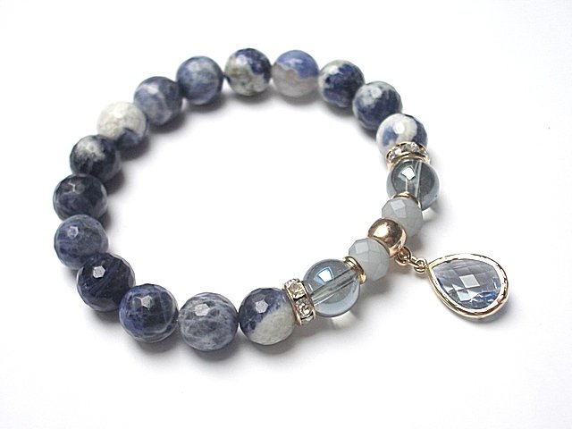 Bransoletka wykonana z fasetowanch sodalitów [10mm],kwarców [10mm] ,kryształków [8mm] , zawieszki szklanej w okuciu oraz elementów metalowych w kolorze złota. Bransoletki pasują na nadgarstek 16-17cm. Biżuteria ozdobnie zapakowana.