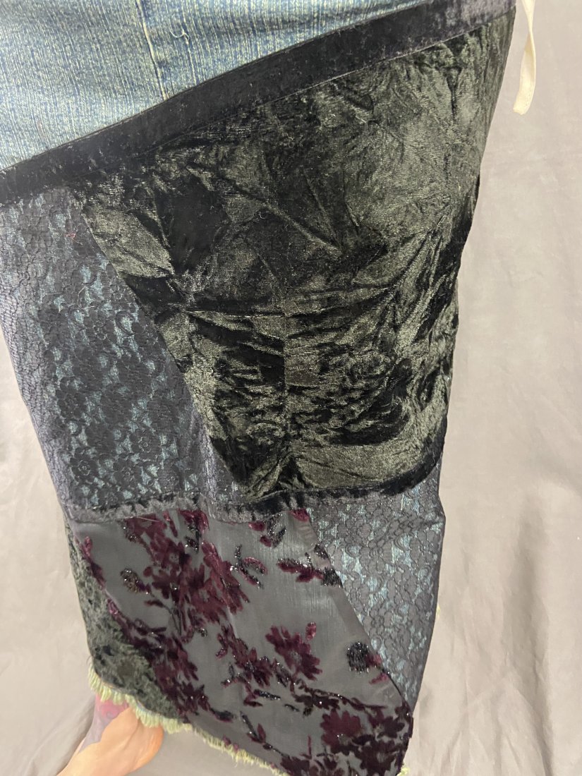 Świetna spódnica z elastycznego jeansu od M-A-P-P Jeans. Z patchworkowym zdobieniem na przodzie - welur+koronka.