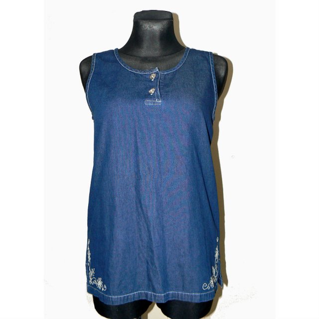 Koszulka z miękkiego granatowego jeansu. Zapinana pod szyją na dwa ozdobne guziki. Bo bokach krótkie rozcięcia i jasny haft.