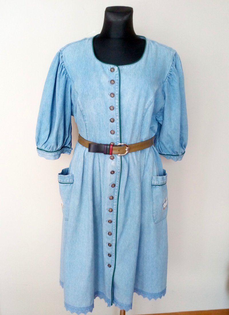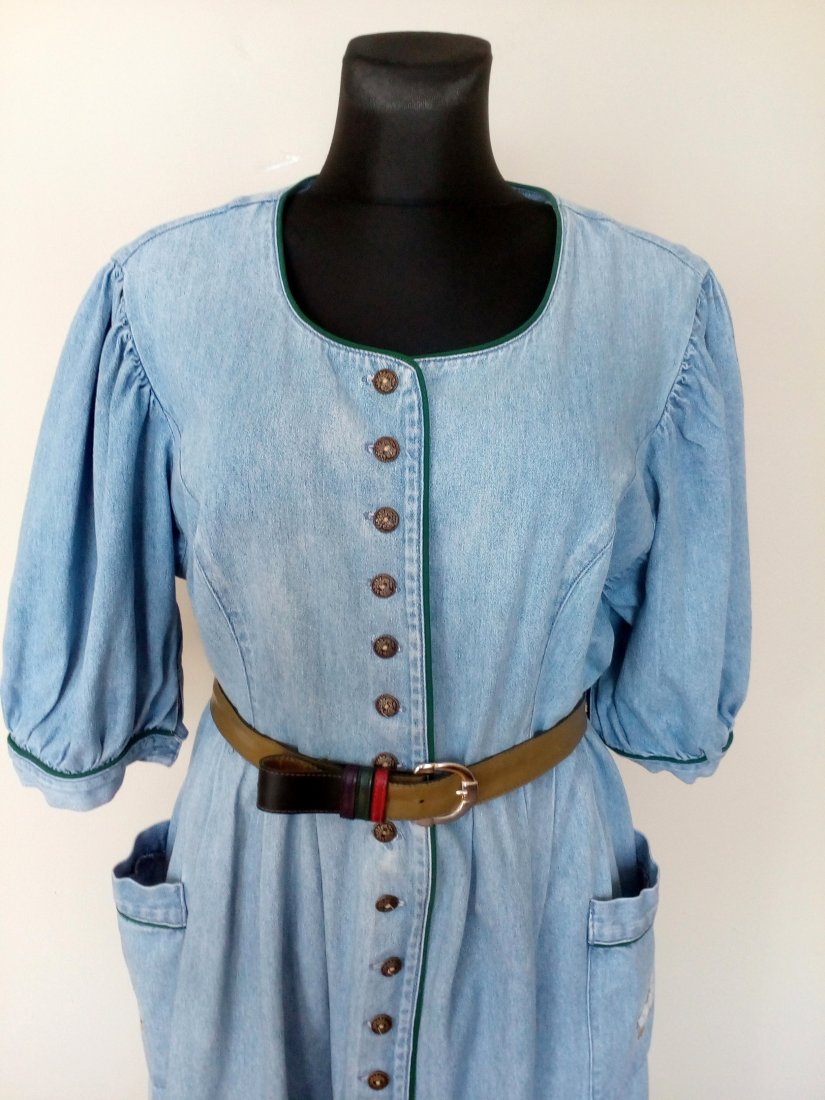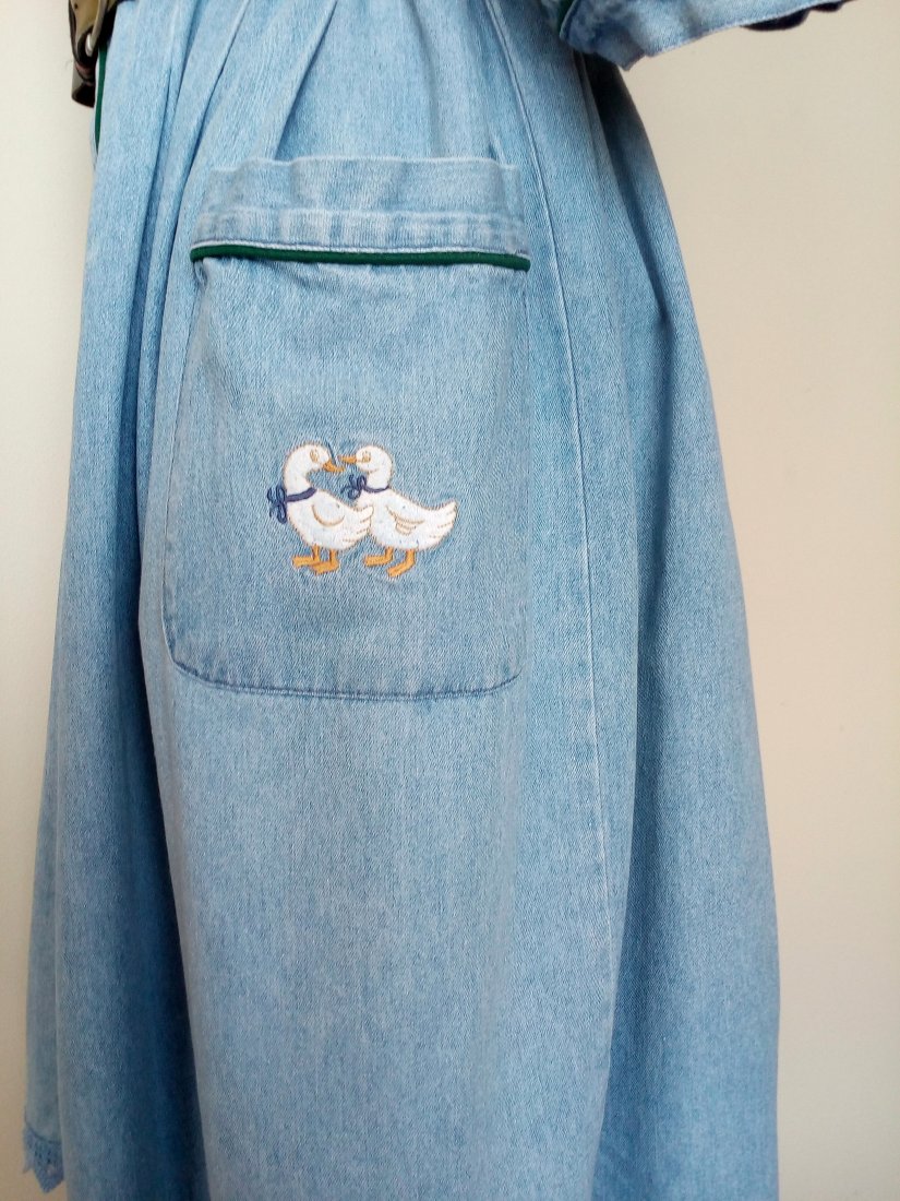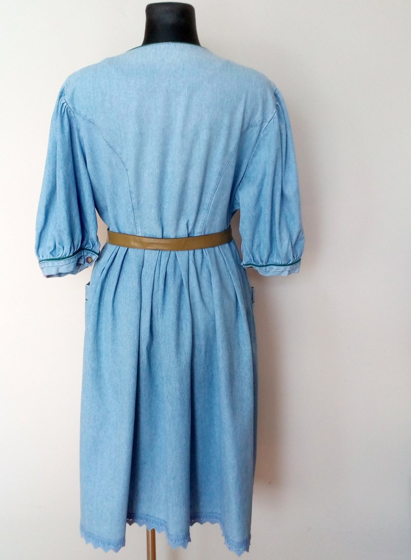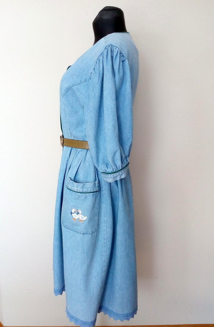 Sukienka z jasnoniebieskiego jeansu, zapinana z przodu na metalowe guziki do wysokosci pasa, do dołu zapięcie zaszyte, rękaw krótki bufiasty zebrany w wąski mankiet zapinany na guzik, zdobiona lamówkami w kolorze butelkowej zieleni, od pasa marszczona szerszymi zakladkami, u dołu doszyta niebieska, bawelniana koronka, z przodu naszywane kieszenie z haftem kaczek, calość bez podszewki, sprzedawana bez paska