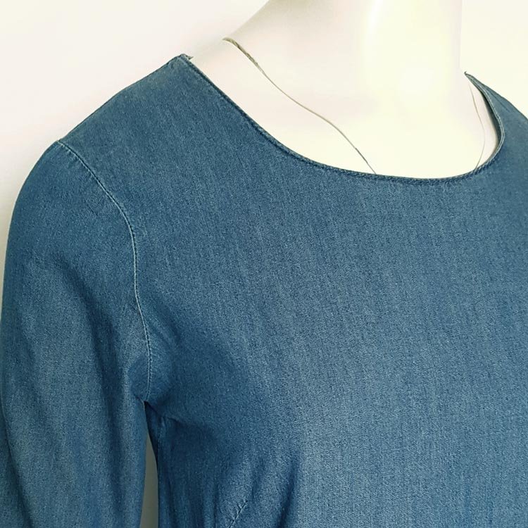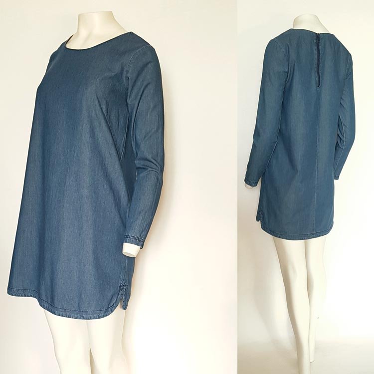 Prosta sukienka jeansowa, lekko rozszerzana do dołu, długość do połowy uda. Dekolt okrągły, w biuście zaszewki modelujące, rękawy długie. Z tyłu zapięcie na zamke kryty.