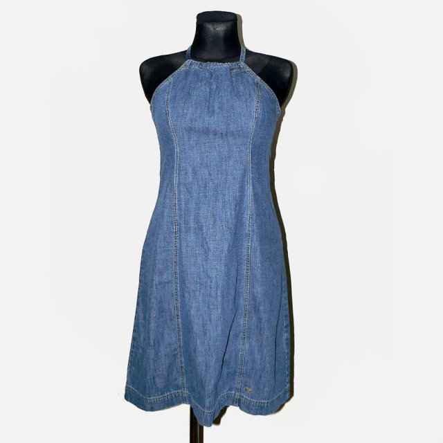 Sukienka z miękkiego jeansu, wiązana na szyję, zapinana na plecach na długi metalowy zamek. Renomowana marka Tom Tailor.