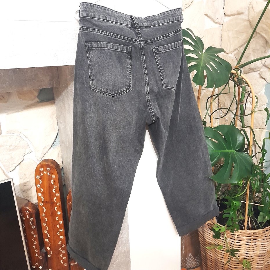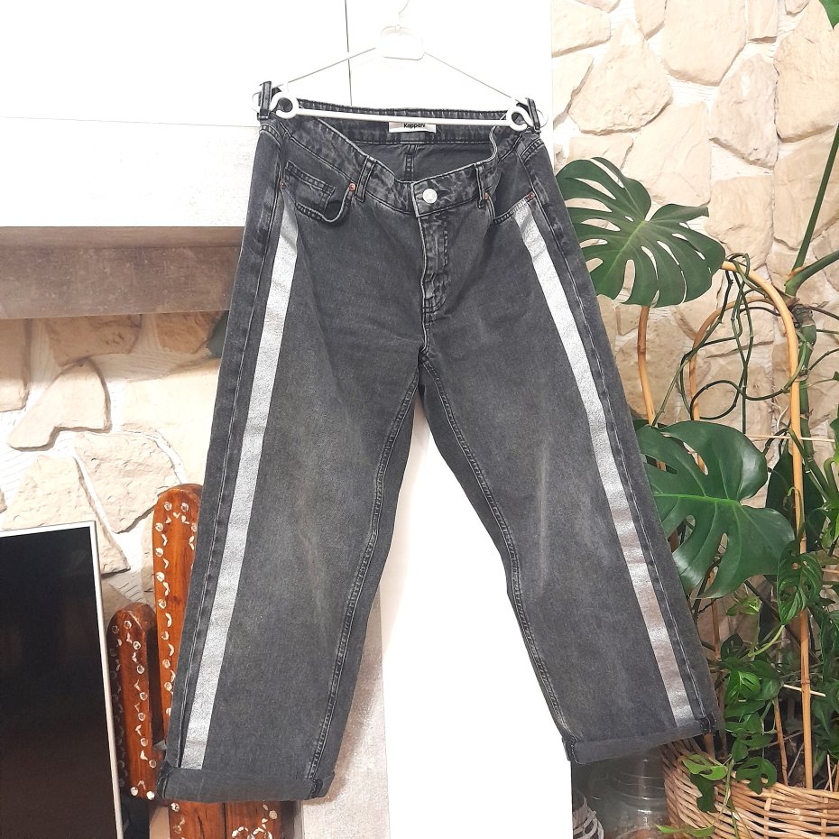 Szary jeans. Srebrny gruby pasek po bokach spodni.