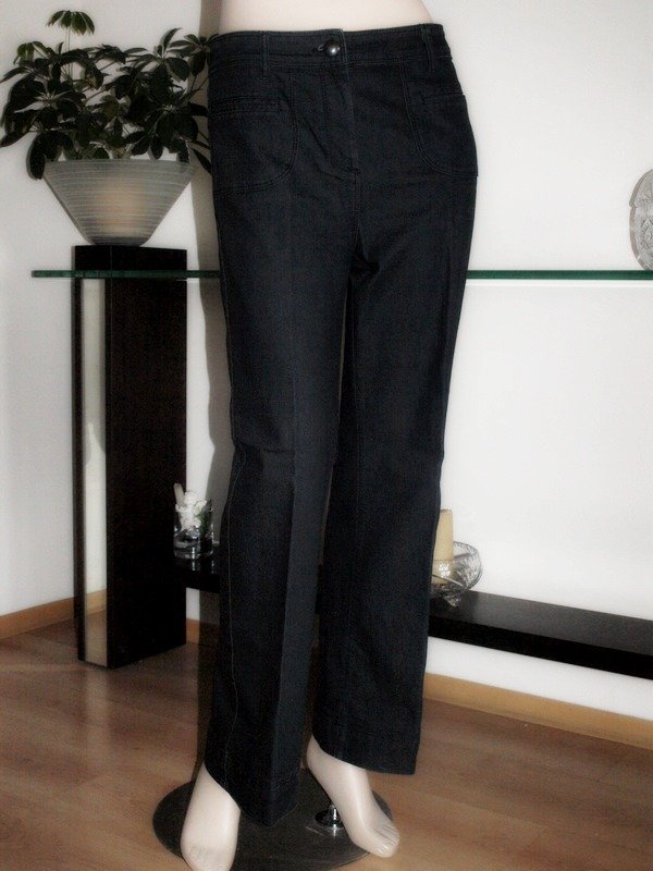 Jeansy w kolorze czarnym, marki M&S. Klasyczne, proste nogawki w kant. Materiał 81% bawełna, 17% poliester 2% elestan. Rozmiar z metki 14. Podaję wymiar mierzone na płasko: