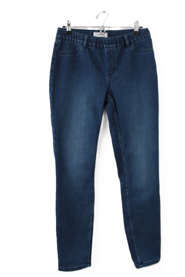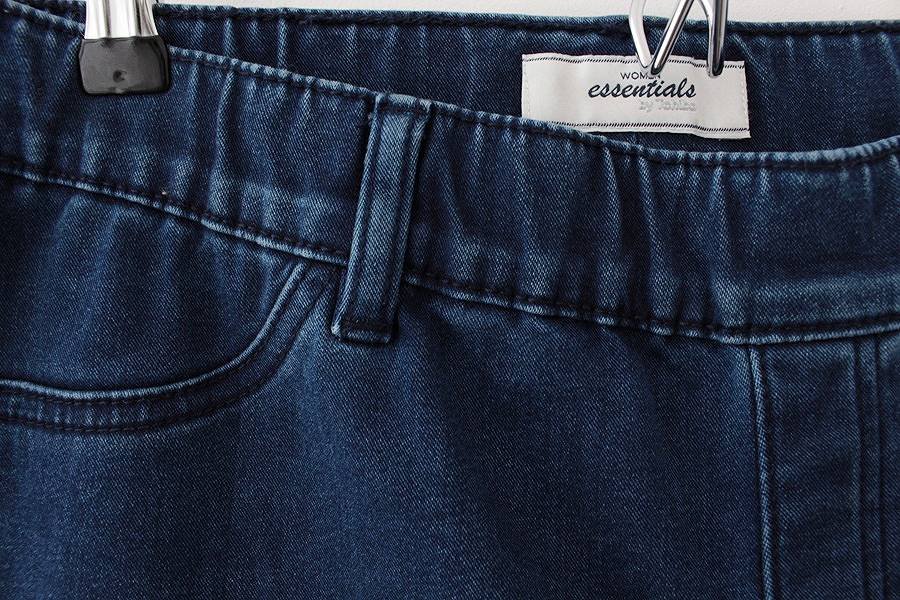 Granatowe jeansy o fasonie typu jegginsy (brak zapięcia na górze). Posiadają elastyczny pas, dzięki czemu są wygodne w noszeniu.
