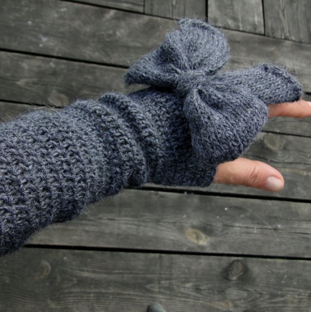 Ekstrawaganckie mitenki wykonane ręcznie ( szydełkiem i na drutach) z wysokiej jakości włóczki ( (50% ALPAKA, 50% new wool w kolorze melanżowej szarości) Ozdobione przestrzenną kokardą. Miękkie i miłe w dotyku. Niebanalny dodatek i ochrona przed chłodem. Długość: ok. 27 cm. Wzór autorski. Polecam serdecznie.