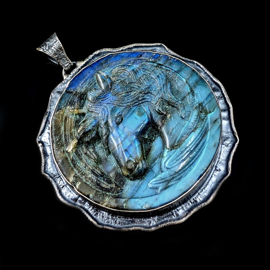 z oprawionym rzeźbionym w labradorycie przepięknym wizerunkiem eterycznego jednorożca.