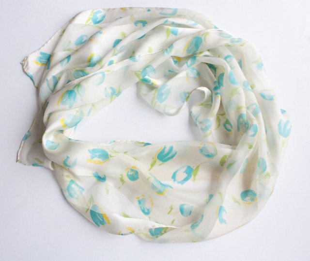 Subtelny szal w błękitne tulipany. Wykonany w 100% z jedwabiu.