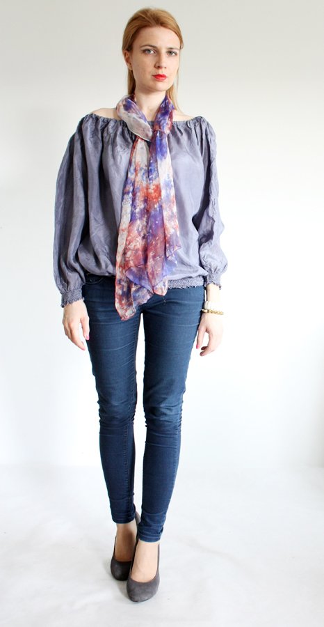 Jedwabna, delikatna bluzka marki CARLA CARLA. Tkanina pięknie się układa, a subtelne detale umożliwiają modyfikację fasonu. Dzięki troczkowi na górze możesz dowolnie układać dekolt, ściągnąć go lub rozluźnić i uzyskać efekt łódki. Gumki na dole pozwalają na uzyskanie efektu bombki, ale nie jest to konieczność :)