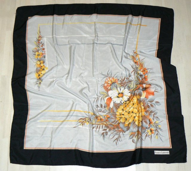 Szara jedwabna chusta w kwiatowy motyw.