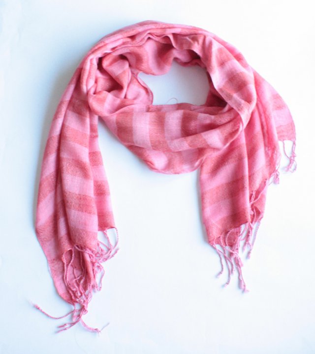 Niezwykle miękki, miły w dotyku szal w pasy w różnych odcieniach różu. Materiał to prawdopodobnie mieszanka jedwabiu i bawełny.