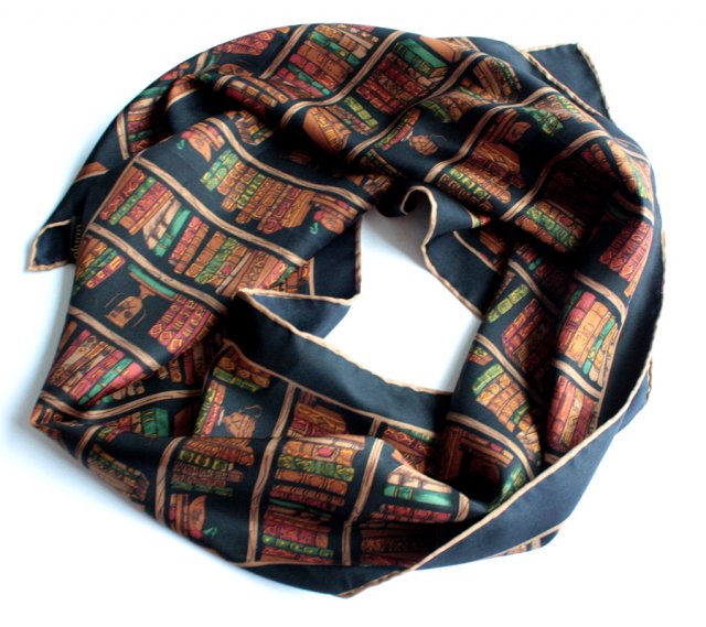 Szal w wyjątkowy, niespotykany wzór książek na czarnym tle. Wykonany z jedwabiu.