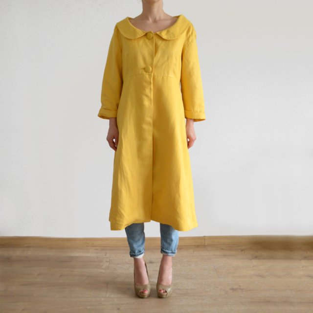 Jedwabny, słonecznikowy płaszcz z kołnierzykiem w stylu retro. Marka LK Bennet. Nie ma kieszonek, na podszewce. Zapinany od góry na dwa większe guziki.