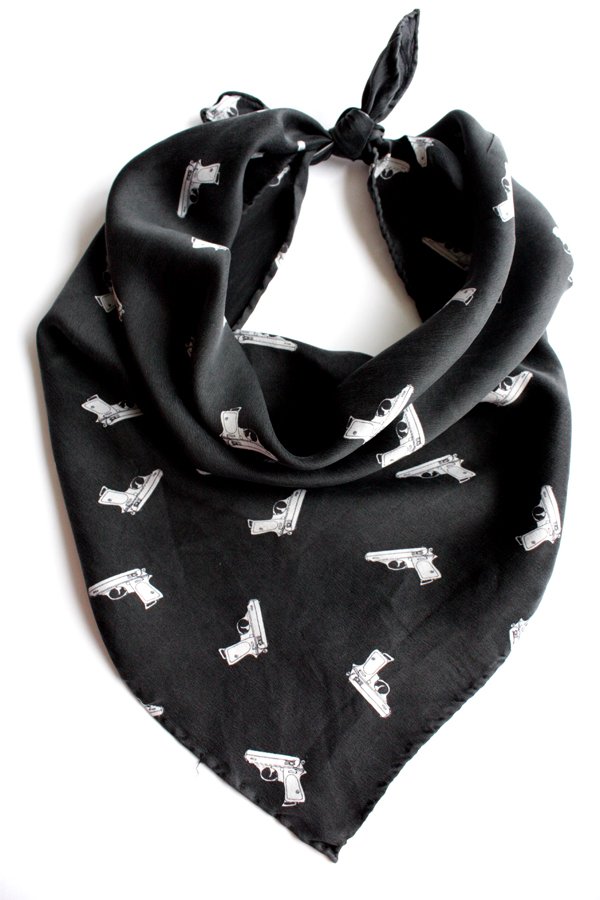 Oryginalna chusta w pistolety wykonana w mojej ocenie z delikatnego jedwabiu. Czerń tła nie jest jednolita. Nie jest to odcień typu smolistej czerni.