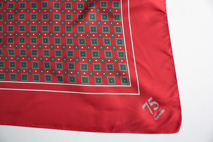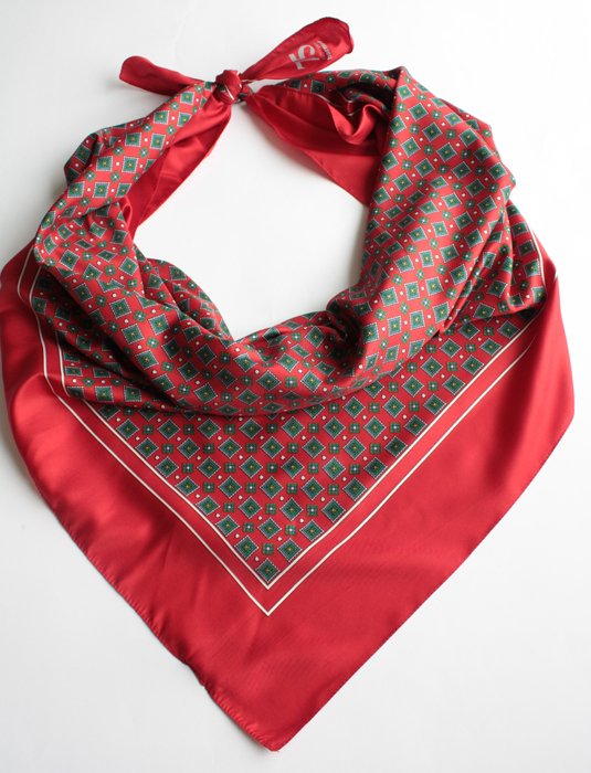 Elegancka chusta wykonana z poliestru, w dotyku przypomina jednak jedwab. Napis na jednym rogu.