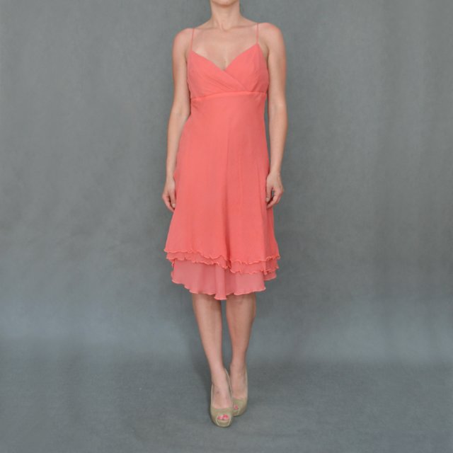 Jedwabna sukienka o bibułkowej fakturze. Na cieniutkich ramiączkach, z tyłu wiązana. Dół z kilku warstw. Polecam.
