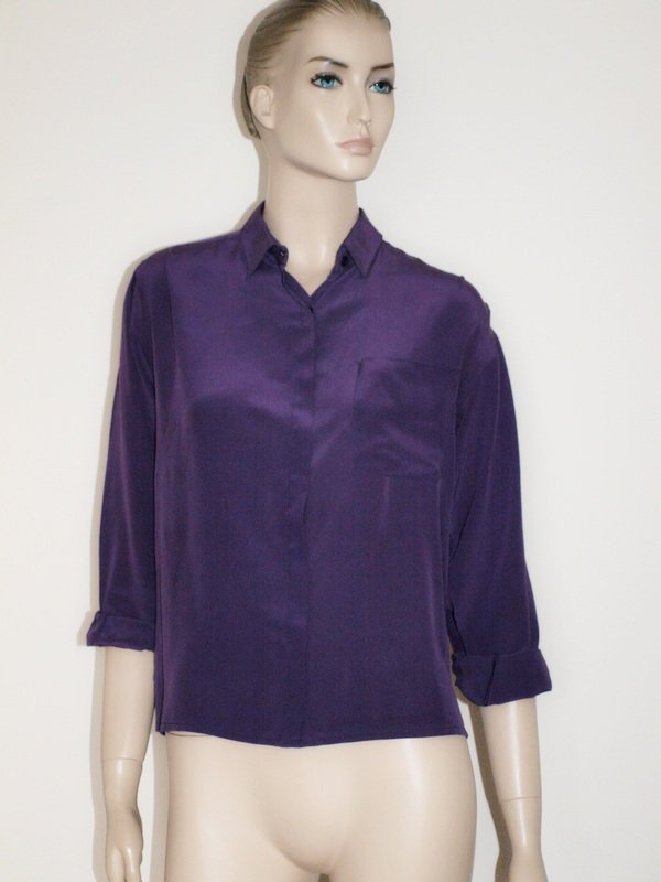 mała jedwabna koszula szwedzkiej marki Pascal. Materiał 100% jedwab. piękny fioletowy kolor. rozmiar z metki 40, ale jest stosunkowo krótka i ma krótki rękaw. raczej do noszenia z rękawem zawiniętym. stan bardzo dobry. guziki chowane pod plisą. Podaję wymiary mierzone na płasko;